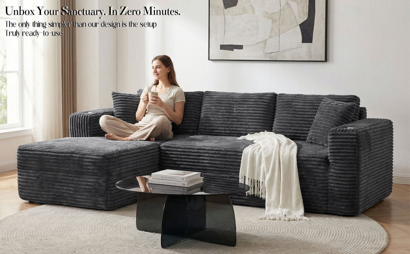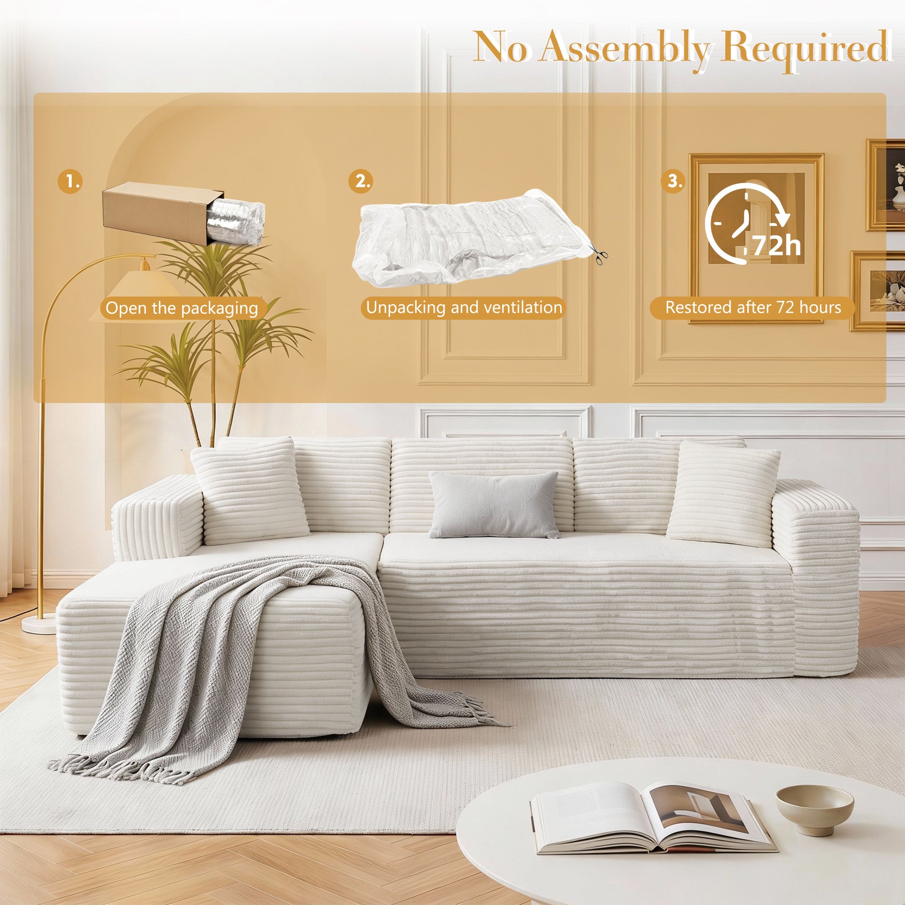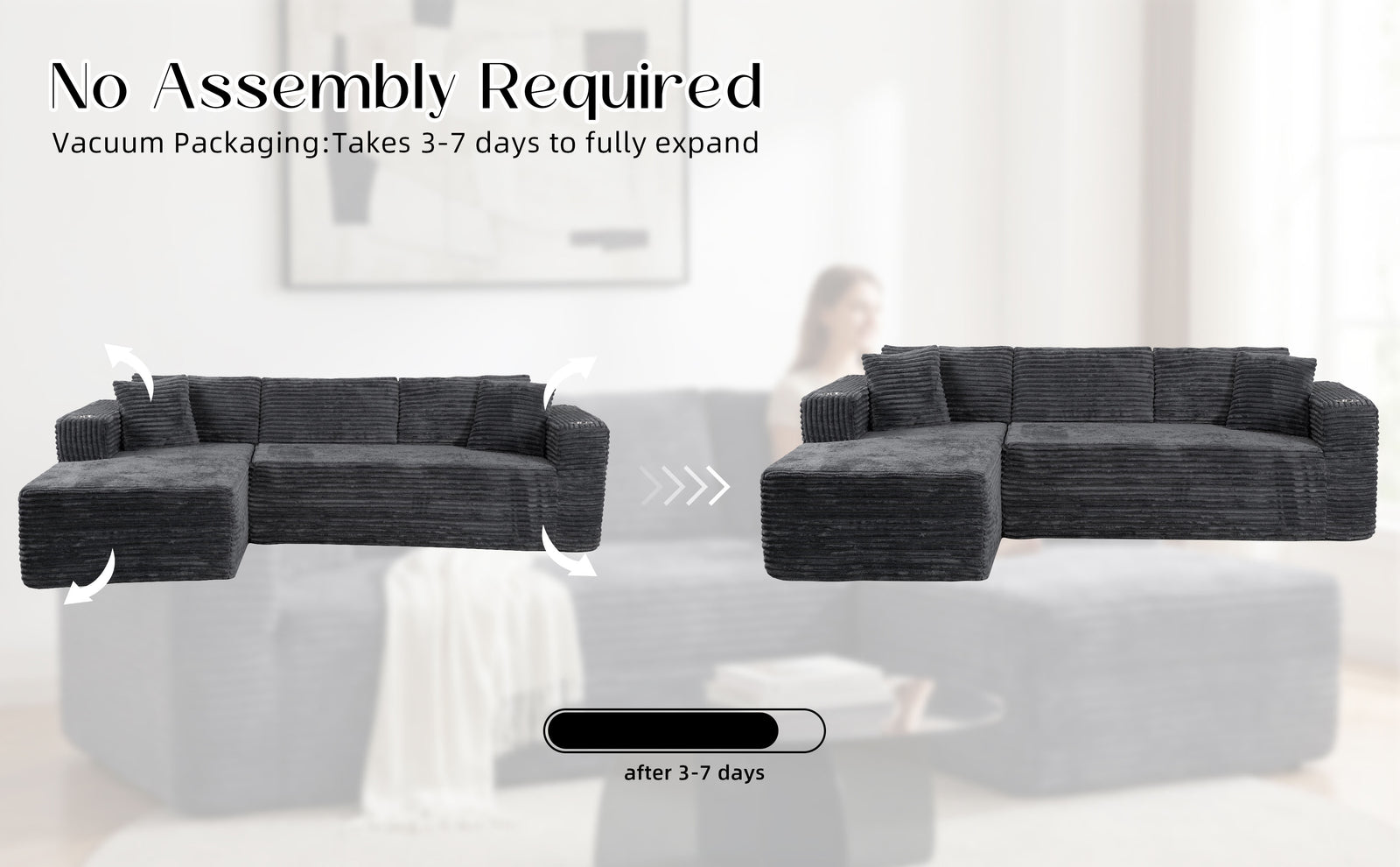 Delivered in two compact boxes (may arrive separately). Simply unbox and allow cushions up to 72 hours to fully expand — no tools required.