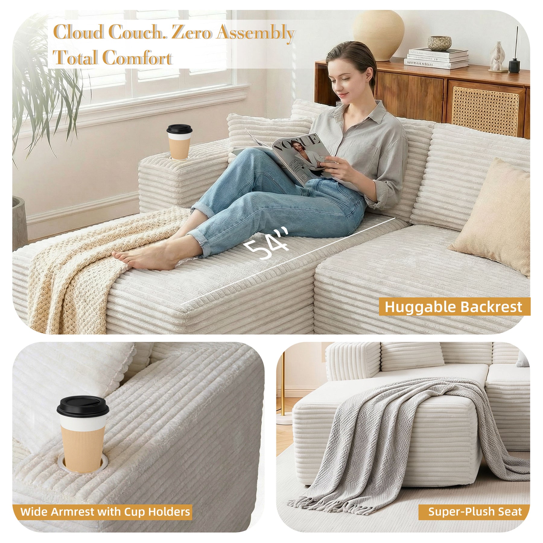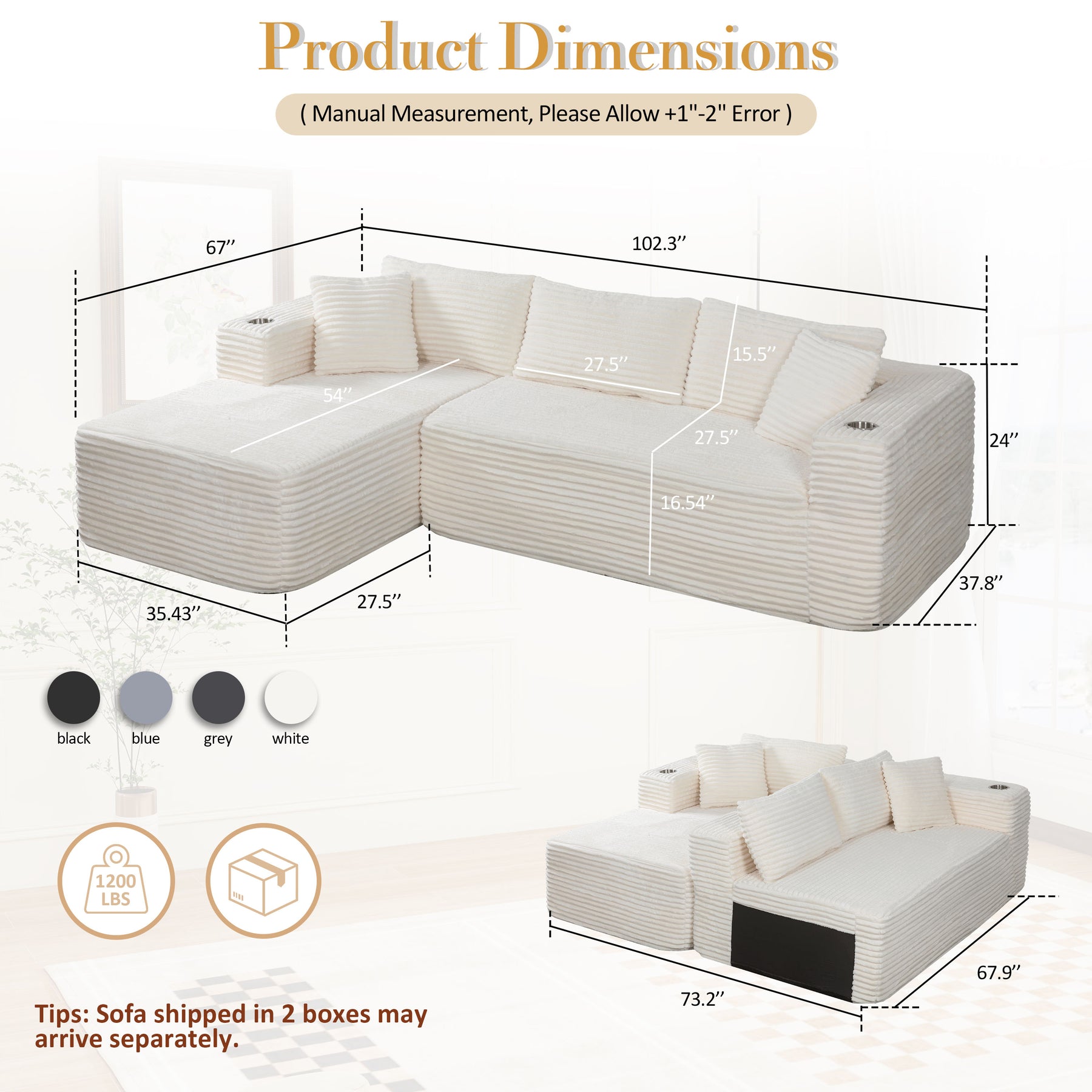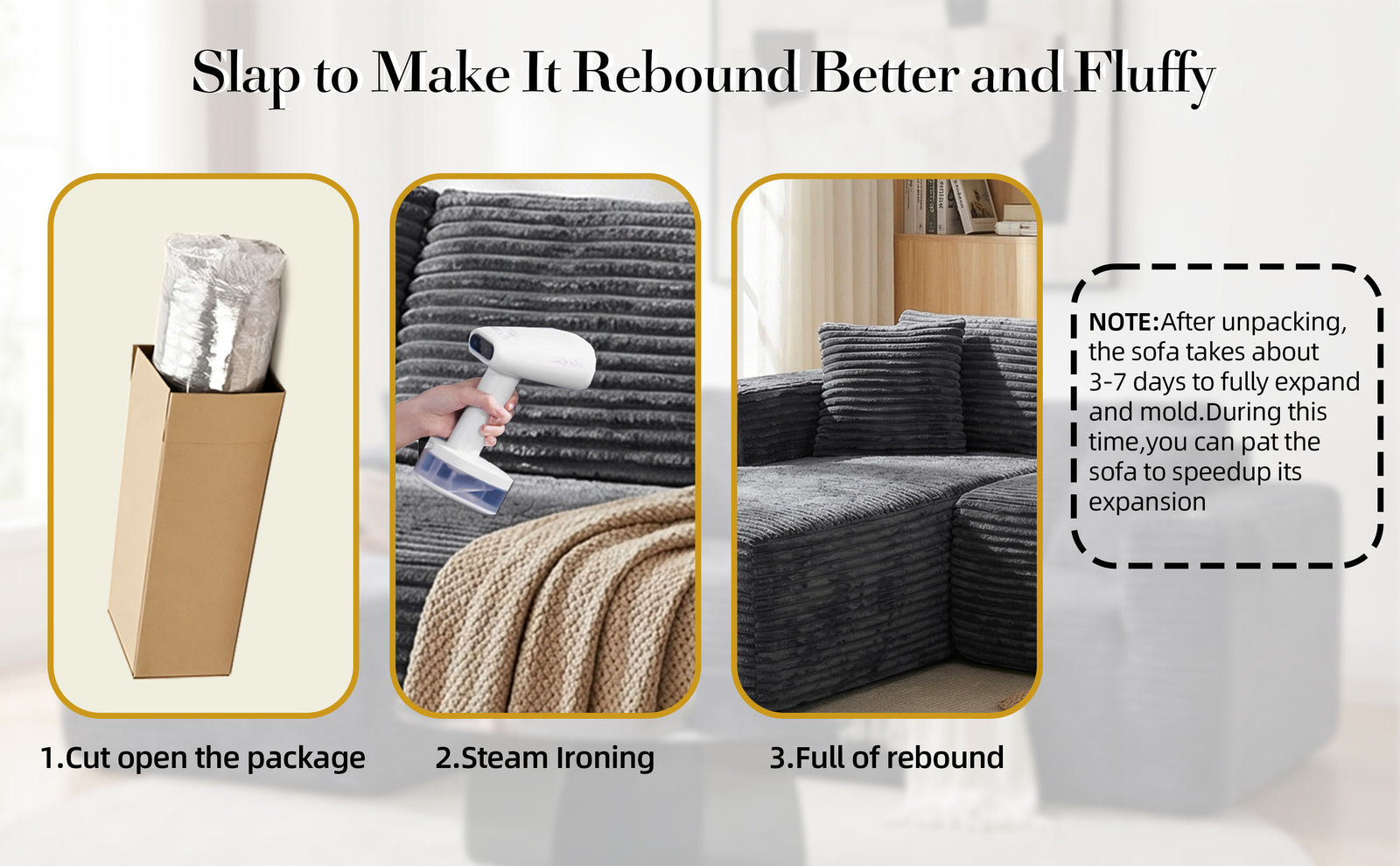 Delivered in two compact boxes (may arrive separately). Simply unbox and allow cushions up to 72 hours to fully expand — no tools required.