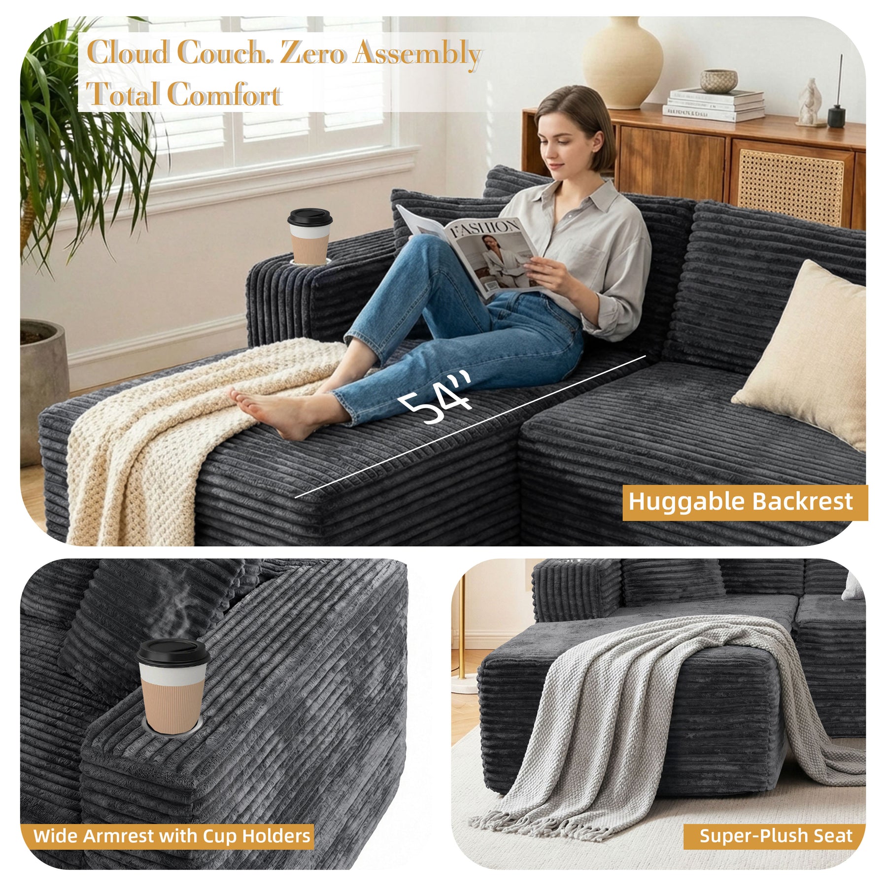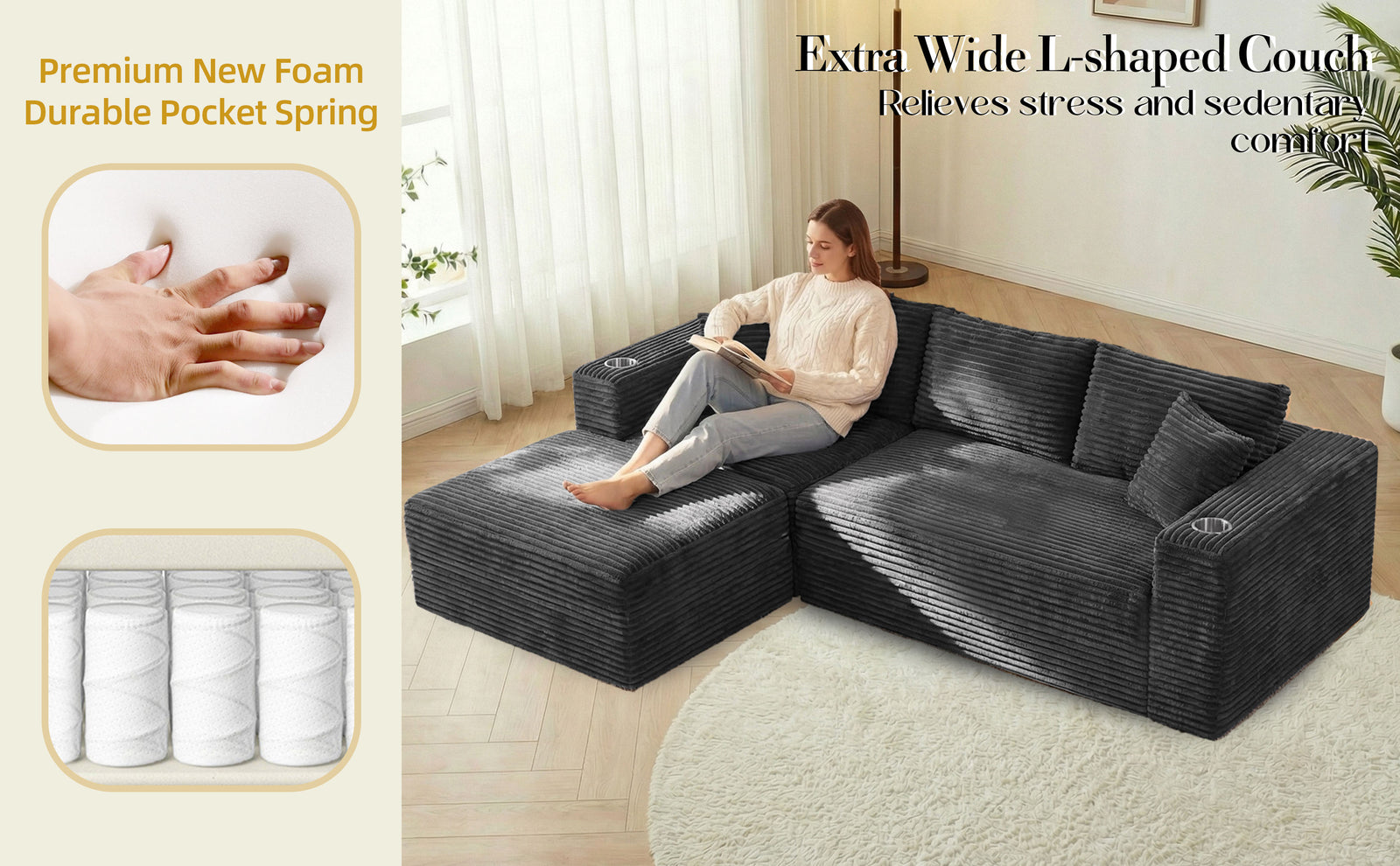 Upgraded corduroy upholstery feels plush and velvety while remaining breathable, wrinkle-resistant, and durable enough for everyday living.